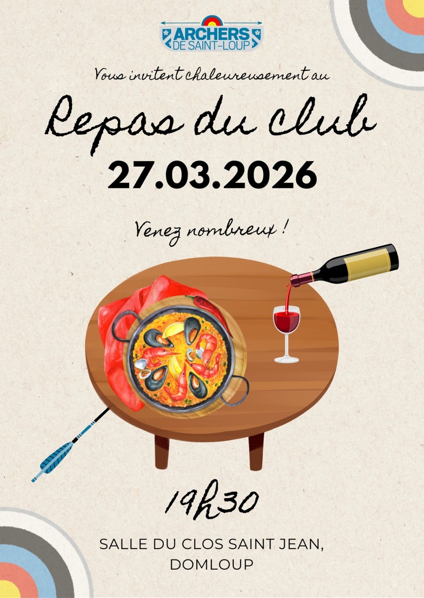 Les archers de St Loup sont heureux de vous inviter au traditionnel repas des archers autour de la paëlla de Marcel le vendredi 27 mars à partir de 19h30 salle du Clos St Jean.